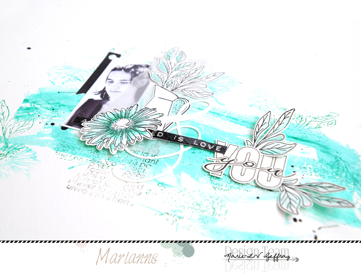 Nouvelle page signée Marianne aujourd'hui par ici, avec un fond travaillé à la gelli, une petite merveille tout simplement.